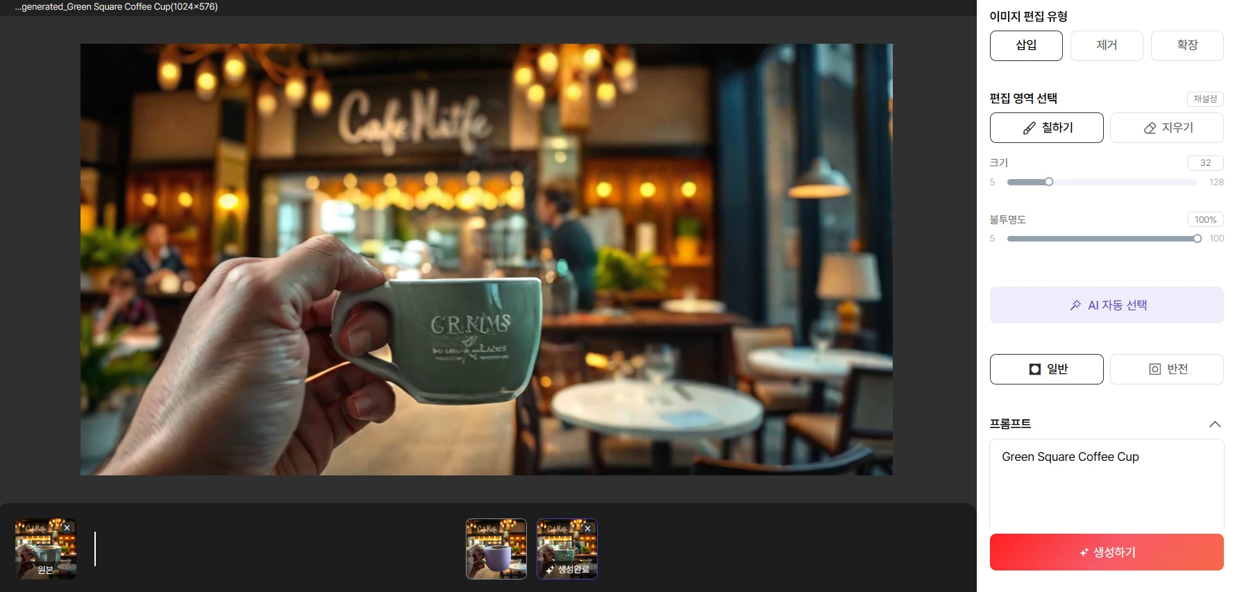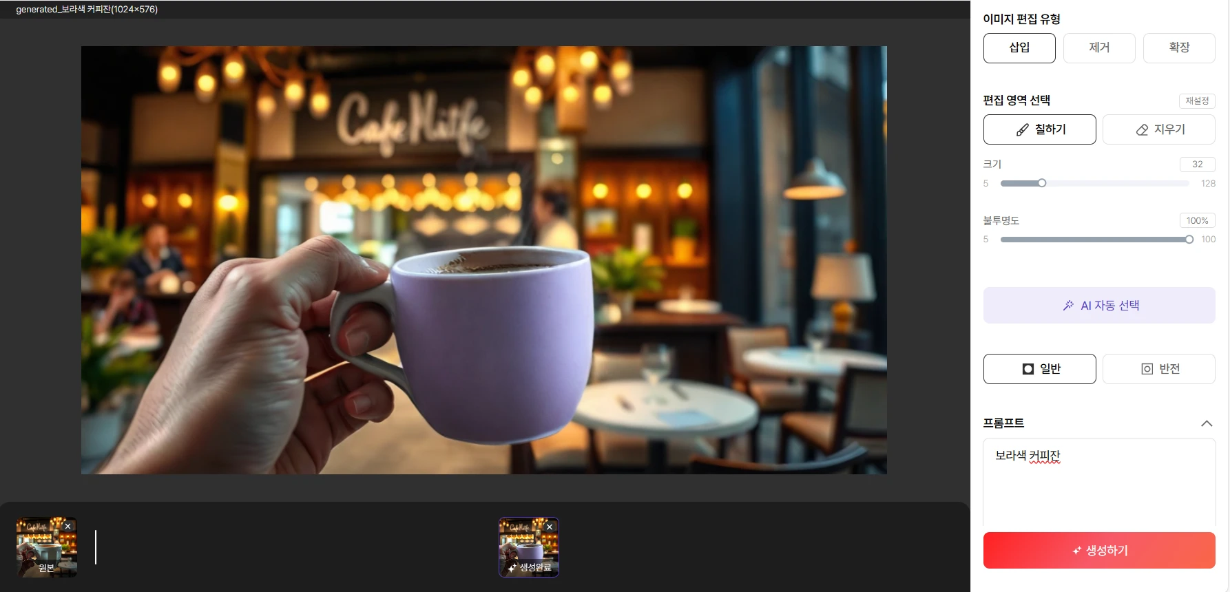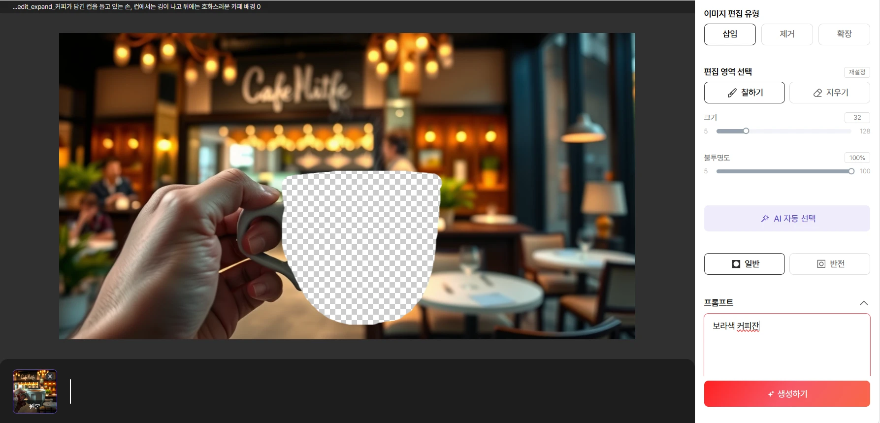삽입 기능은 선택된 영역을 바탕으로 프롬프트로 적용하여 해당 부분을 채우는
