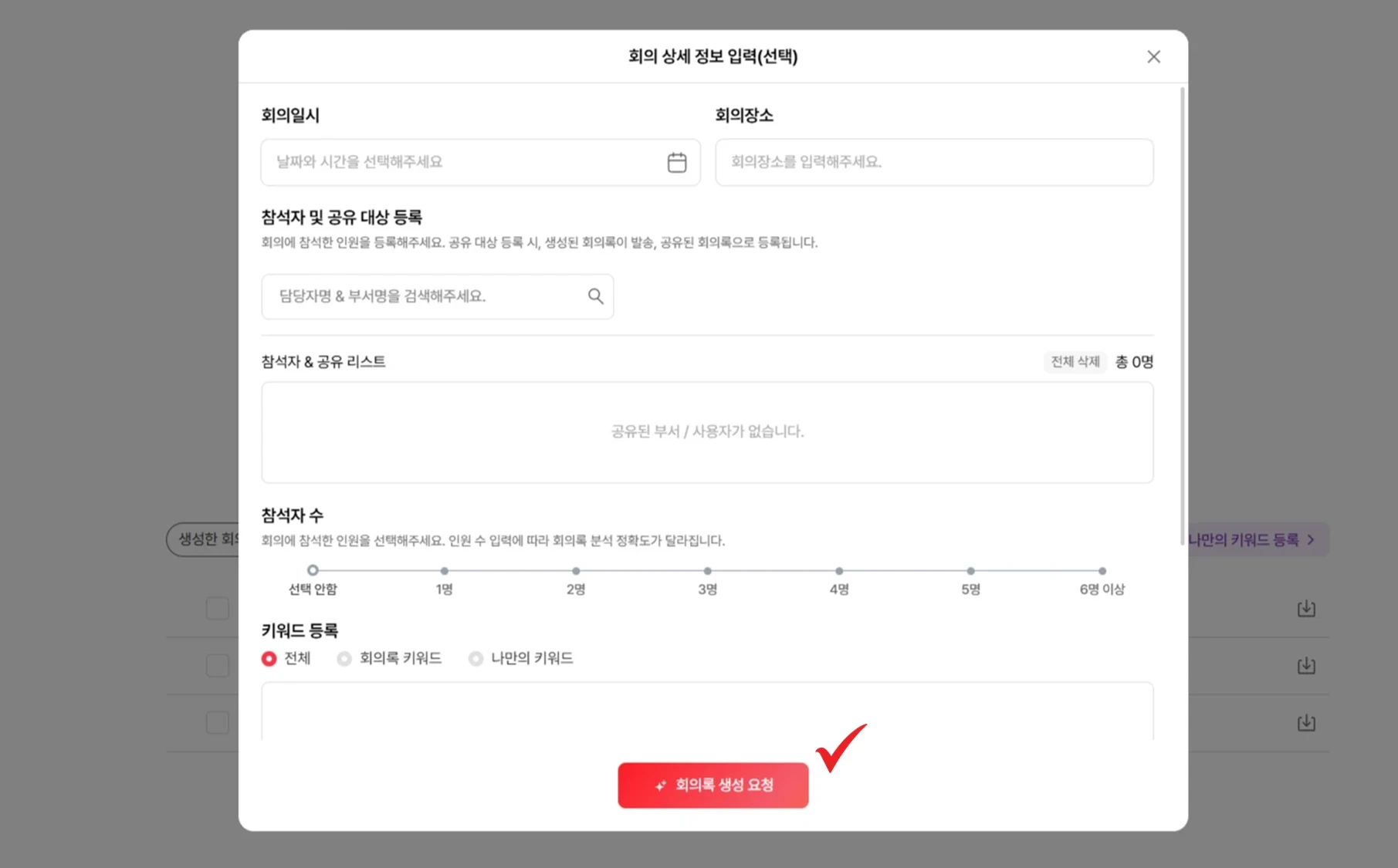 버튼을 클릭하면 회의 상세 정보를 입력할 수 있습니다. (선택사항)