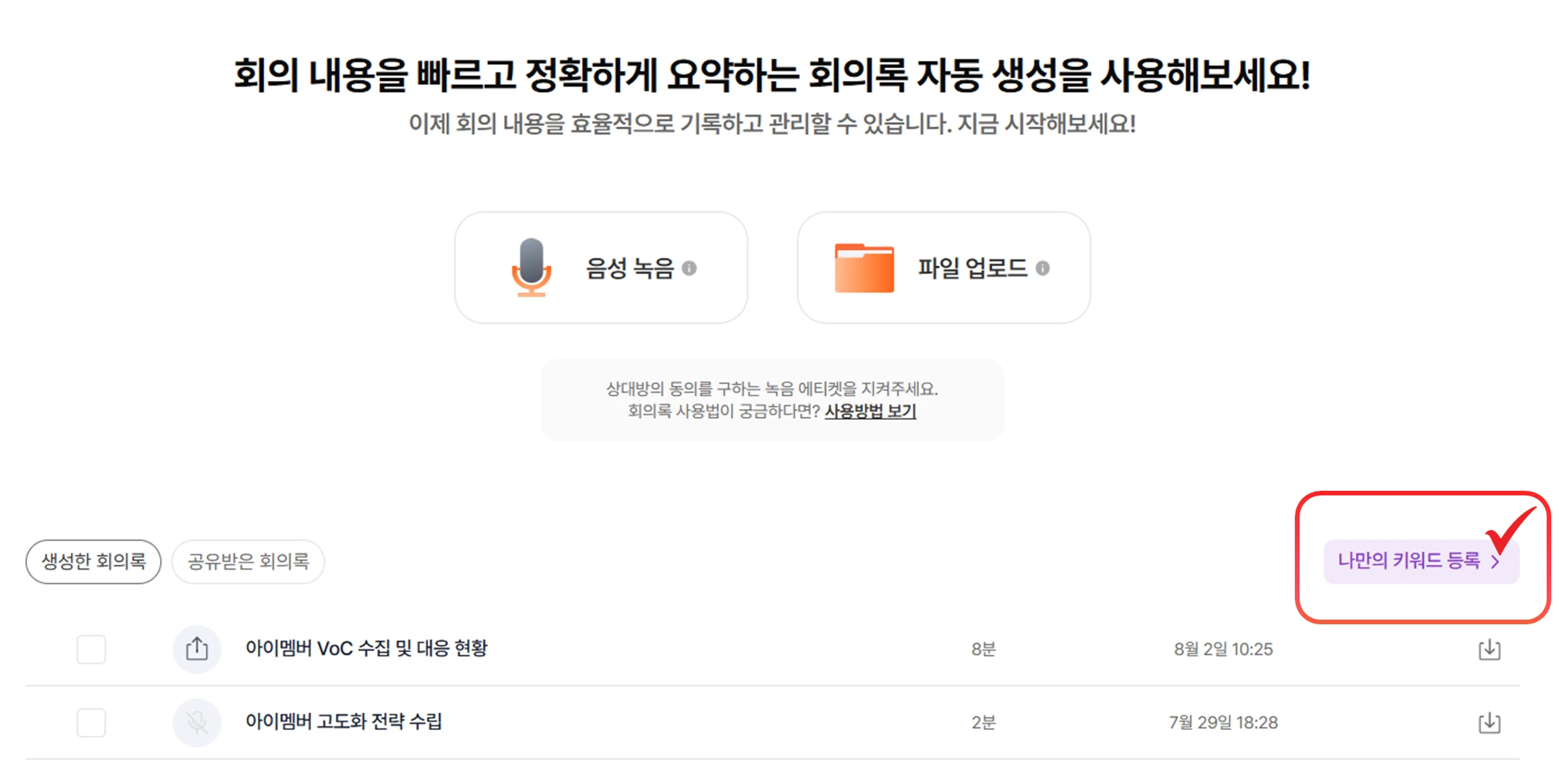 로 등록하면 업무에 특화된 AI 회의록 사용이 가능합니다.