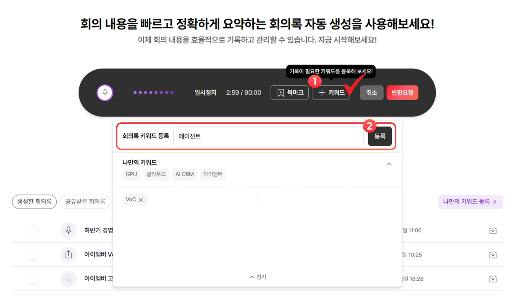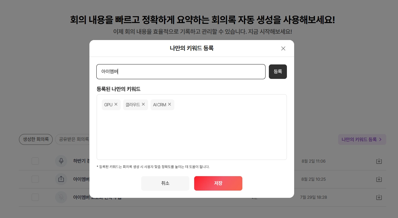 등록된 키워들은 회의록 변환시 반영되며, 필요 없는 키워드는 바로 삭제할 수 있습니다.