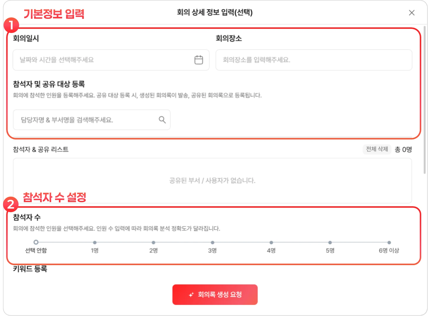 회의 일시·장소 및 참석자 정보를 입력하면 회의록에 함께 표시됩니다.