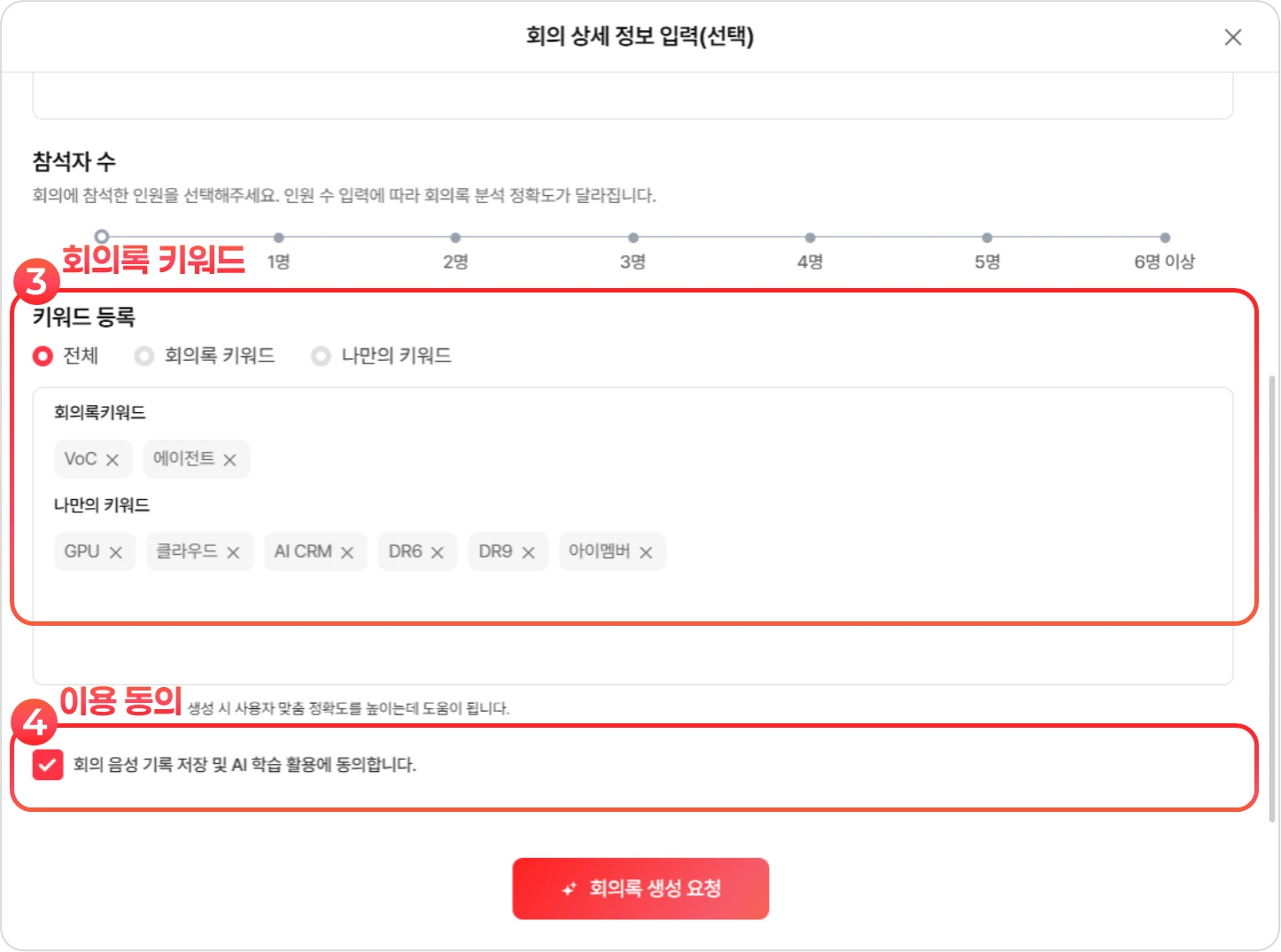 회의 음성 기록 저장 및 AI 학습 활용에 동의가 필요합니다.