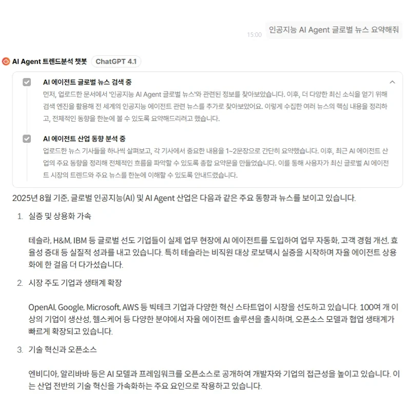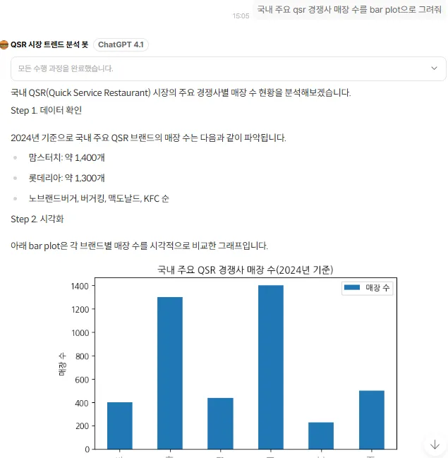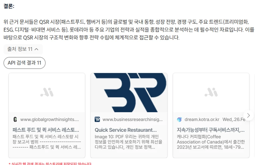 : 프롬프트에 "최신 웹 검색을 통해"라고 명시하면 챗봇이 실시간 웹 검색을 통해 최신 시장 동향, 경쟁사 정보, 뉴스 등을 수집하여 분석 보고서를 생성합니다.