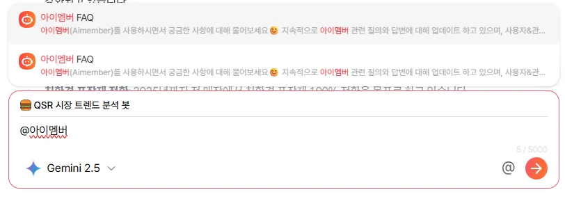 : 한 챗봇과의 대화 중 @기호로 다른 챗봇을 호출하면, 이전 대화 내용과 맥락을 그대로 유지하면서 새로운 챗봇의 전문 지식과 업로드된 데이터를 활용한 심화 분석이 가능합니다.