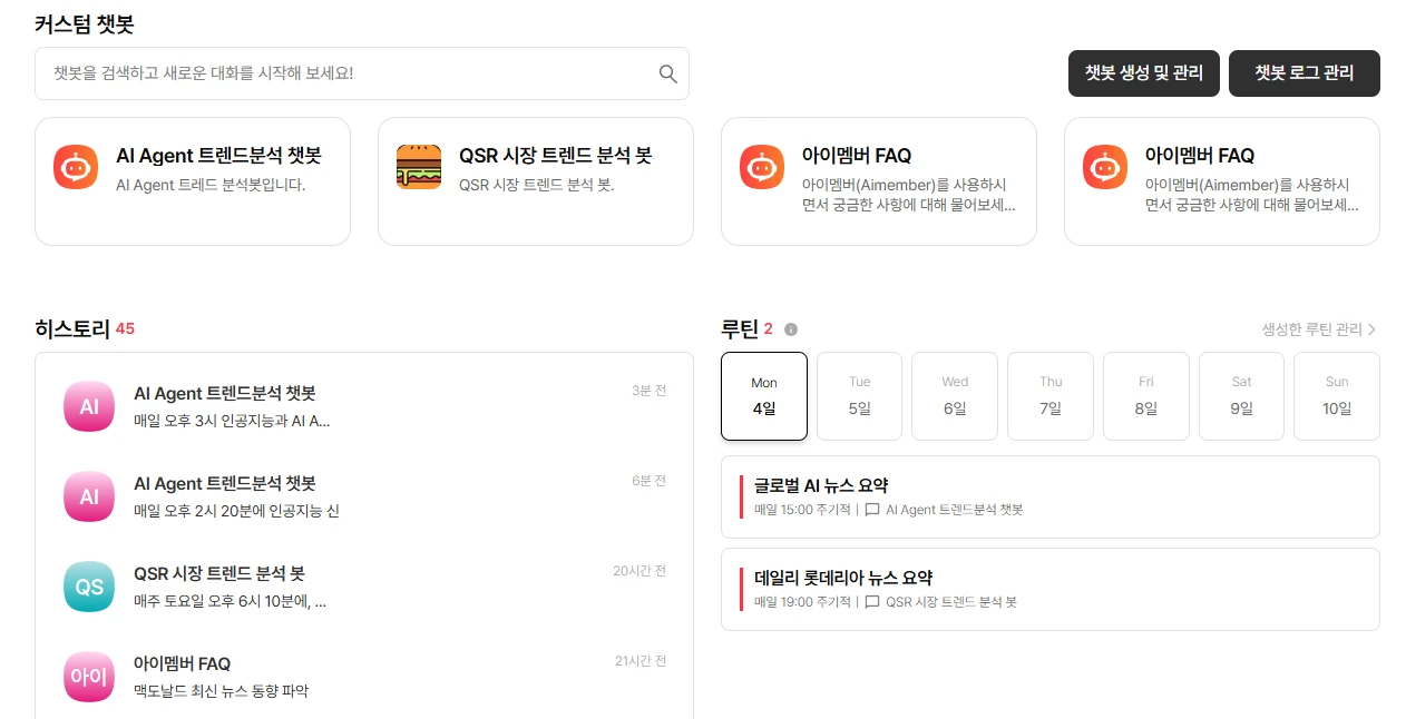 : AI 비서 메인 화면에서 빨간 점이 표시된 대화 히스토리를 클릭하면 자동 실행된 루틴의 결과를 바로 확인할 수 있어, 출근과 동시에 하루의 핵심 정보를 파악할 수 있습니다.
