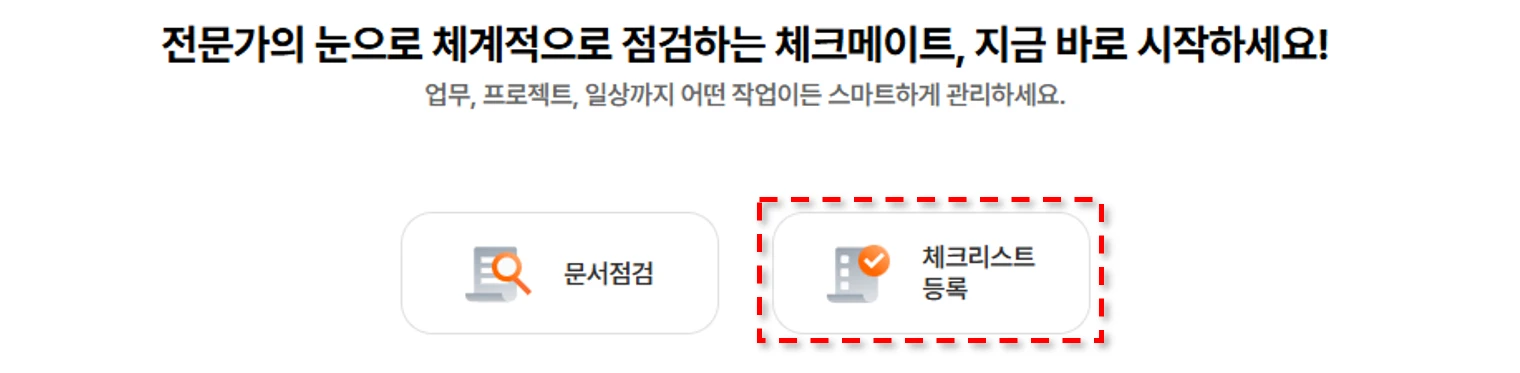 체크메이트 메인 페이지에서 우측 '체크리스트 등록'을 클릭하면 해당 페이지로 내가 사용하고자 하는 체크리스트를 등록할 수 있습니다.