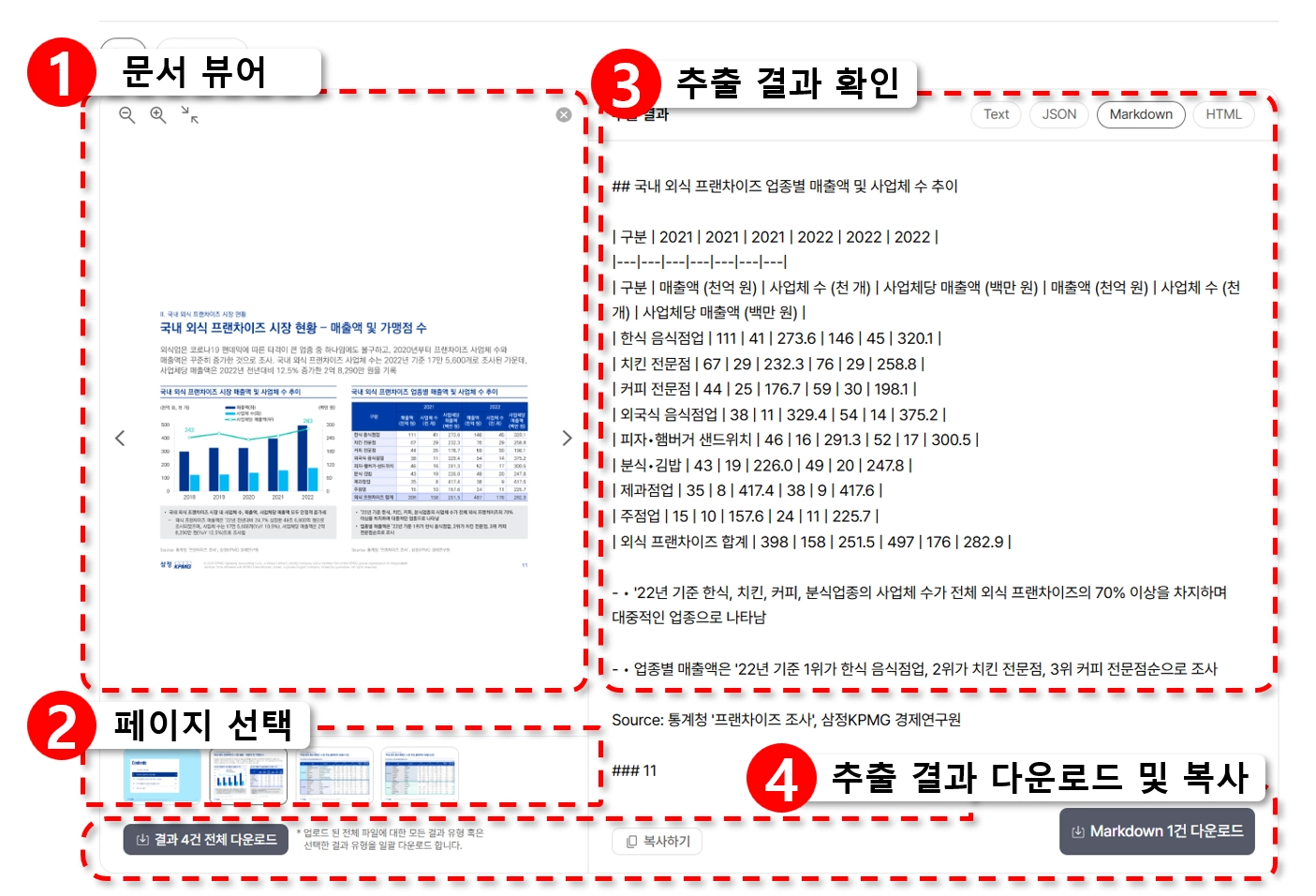 기존 문서에서 발견한 표나 데이터 일부를 내 문서에 그대로 활용하고 싶은 경우, 표 단위로 추출하여 복사하거나 표 단위로 추출하여 복사하거나 JSON, Markdown, TXT, HTML형태로 내보내기할 수 있습니다.