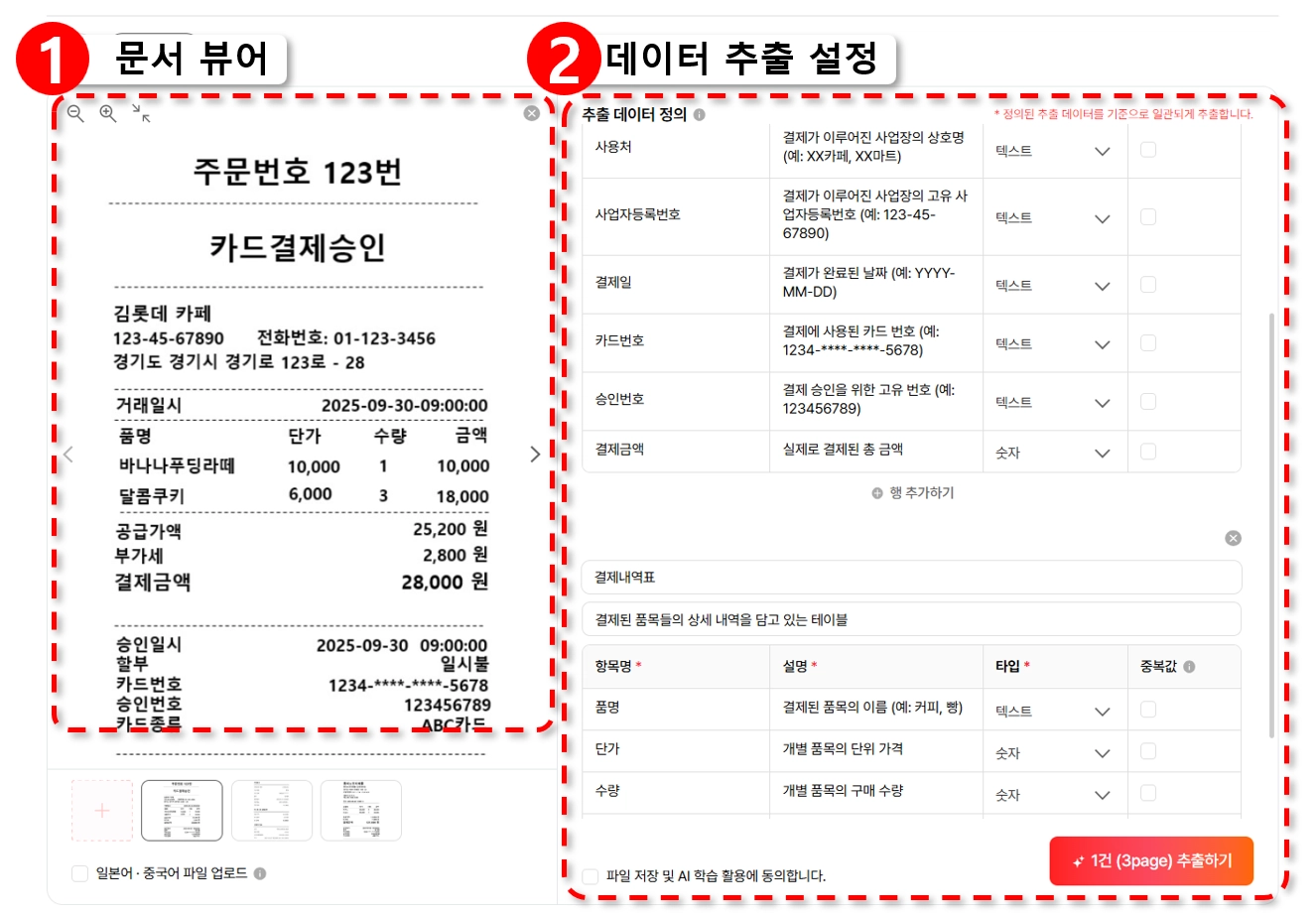 ① 문서 뷰어: 추출하고자 하는 원본 데이터를 확인합니다.