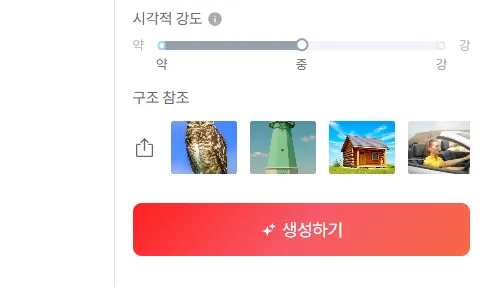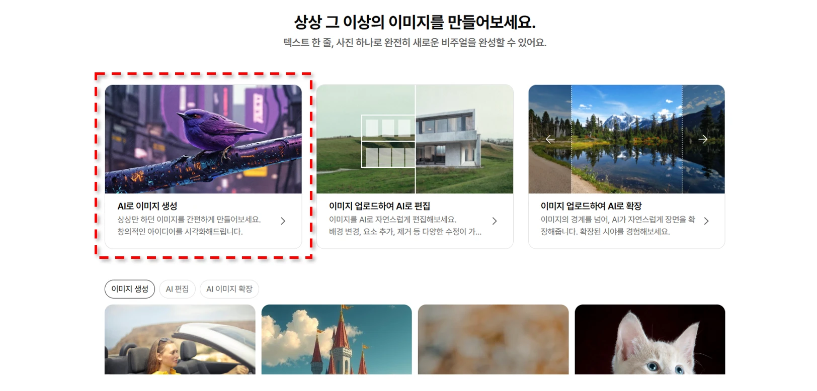 매인 UI 중 맨 좌측의 [AI로 이미지 생성]으로 AI 이미지 생성 기능을 이용할 수 있습니다.