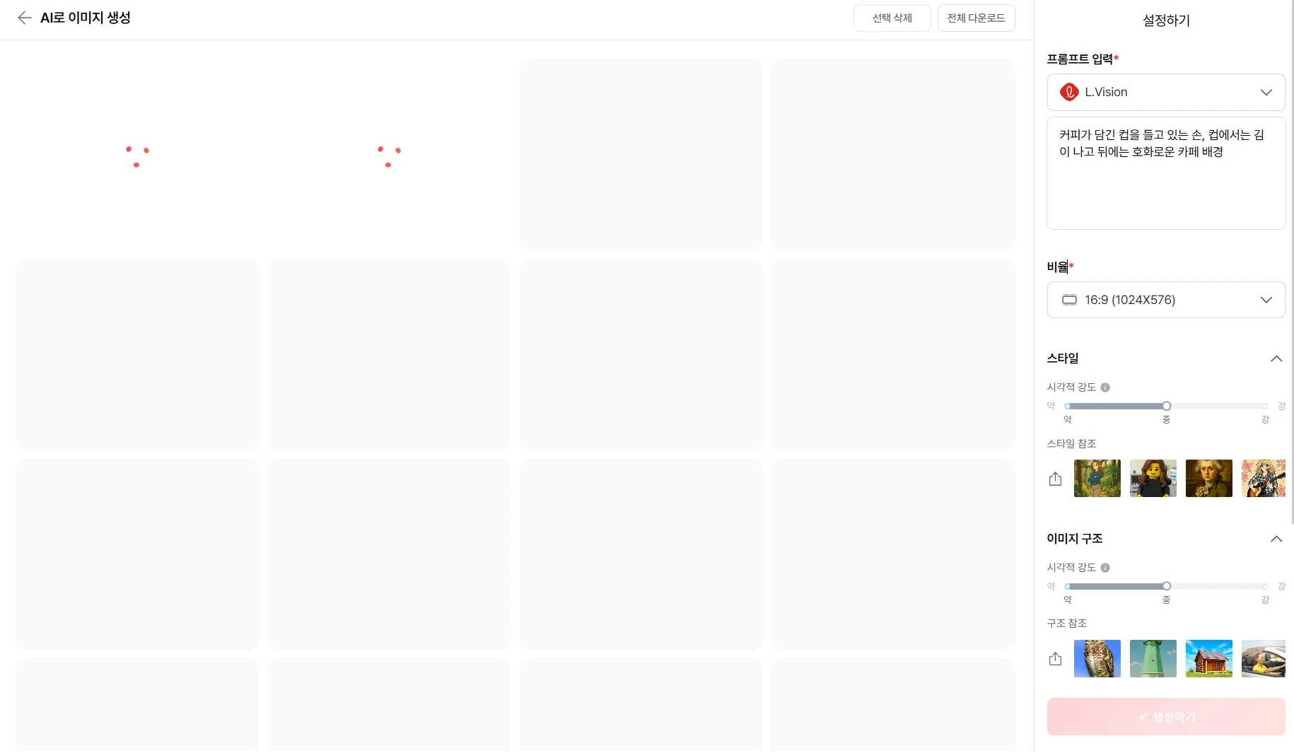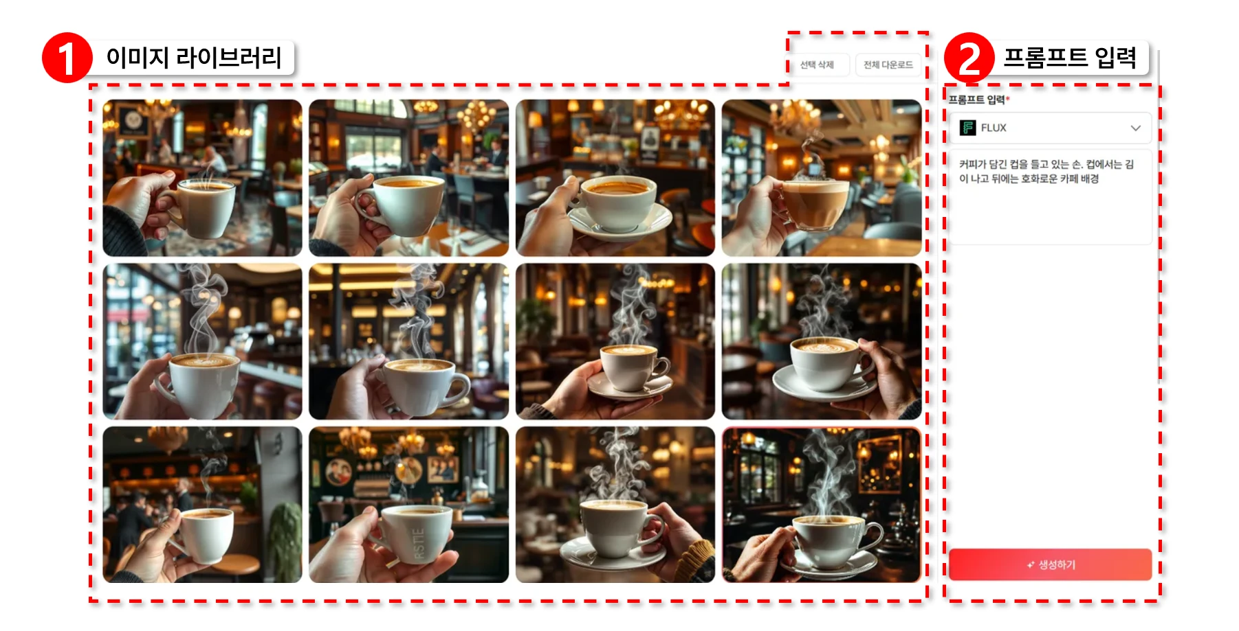 생성된 이미지들은 해당 페이지에서만 유지 됩니다. 새로고침 또는 페이지 이탈 시 이미지들은 모두 삭제되니, 사용할 이미지들은 다운로드 받아주시길 바랍니다.