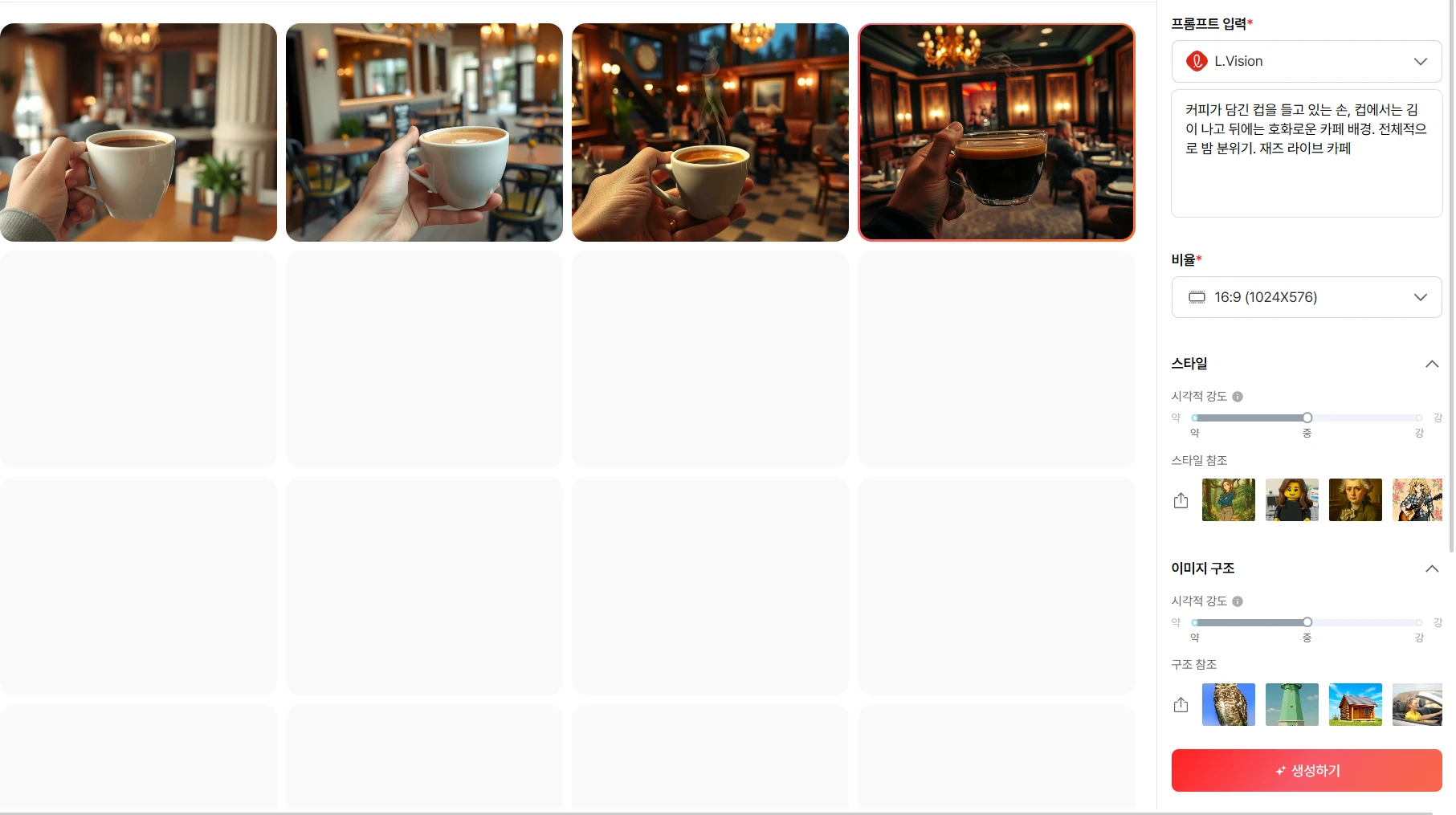 프롬프트를 수정한 후 [생성하기] 버튼을 누르면, 추가 요청한 이미지가 프롬프트 수정 전 생성 이미지와 함께 표시됩니다.