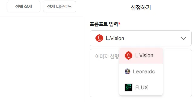 상용 이미지 모델 Leonardo와 Flux를 지원하며 취향에 맞는 이미지를 생성할 수 있습니다.