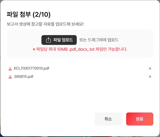 파일 당 최대 10MB, pdf, docx, txt 파일을 지원합니다.