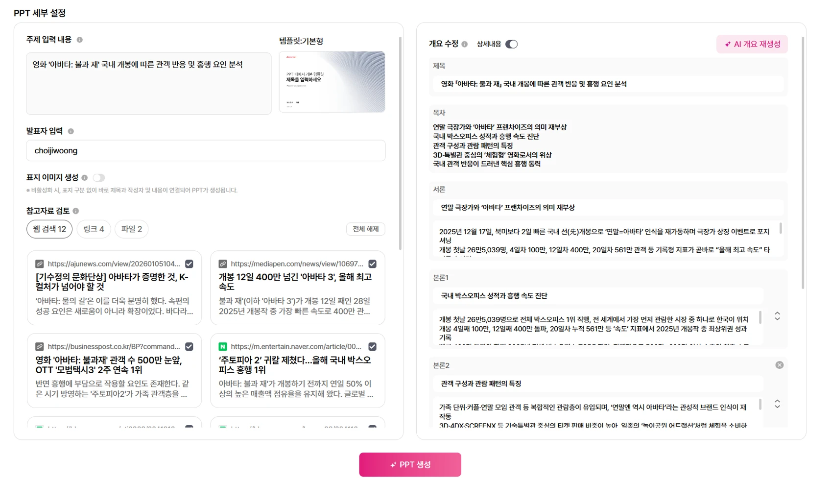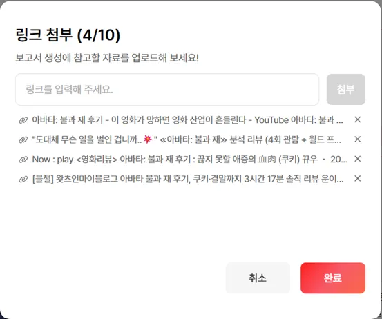 입력된 참고자료(자동 웹검색, 링크, 파일)를 토대로
