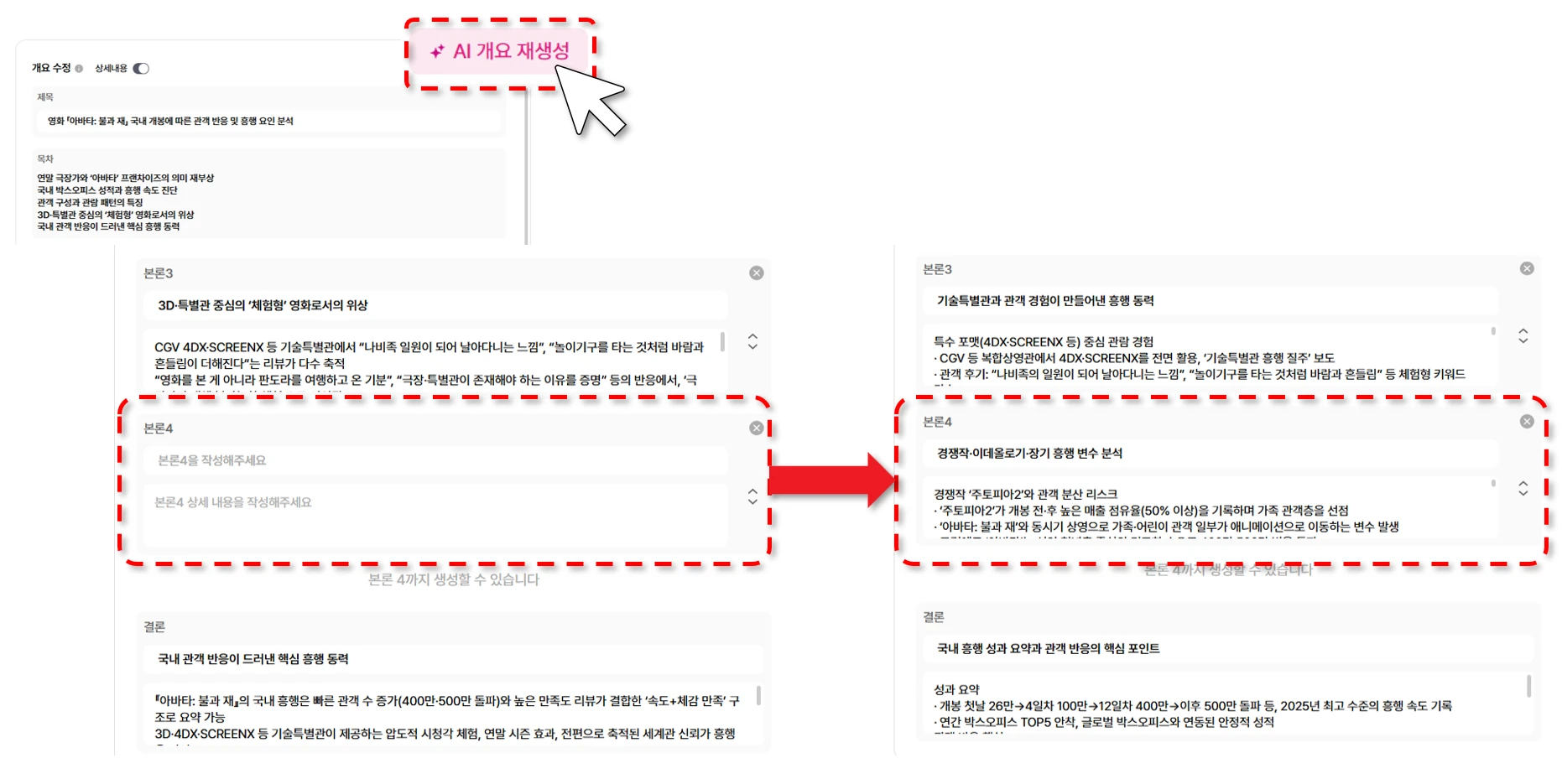 AI 개요 재생성을 누르면 목차를 기반으로 전체 재생성도 가능합니다.