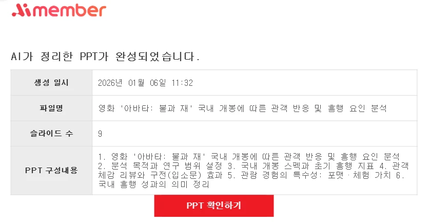 PPT 생성이 완료되면 알림 또는 이메일로 안내를 받을 수 있습니다.