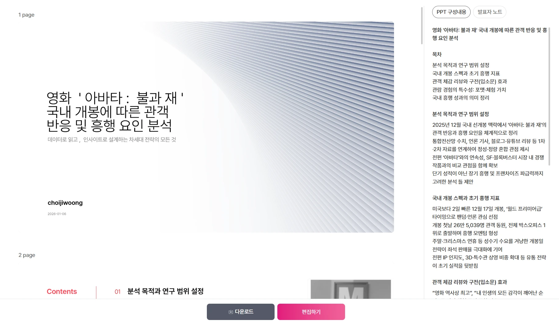 완성된 PPT는 편집 가능한 형태(PPTX)로 다운로드할 수 있습니다.