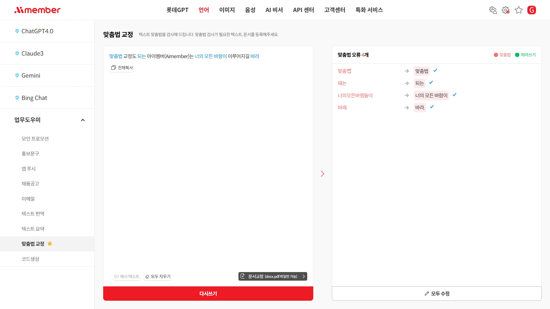 하단의 [모두 수정] 버튼을 누르면 전체 교정된 결과 텍스트를 확인할 수 있습니다.