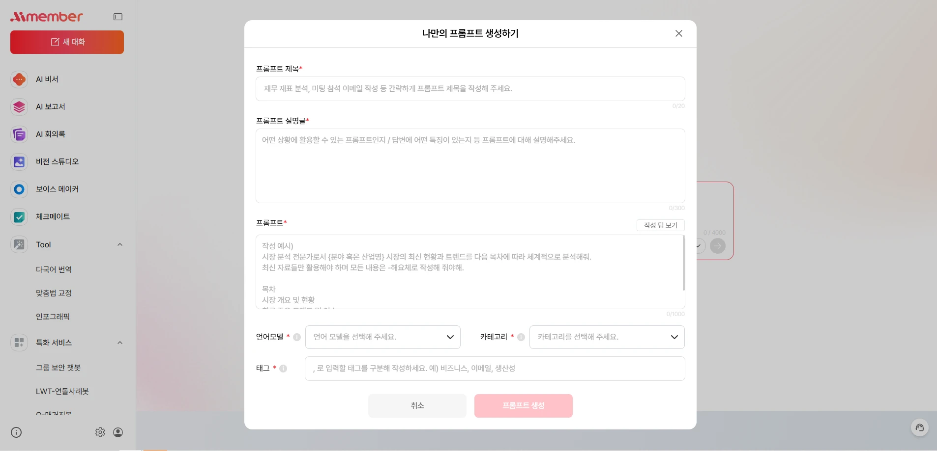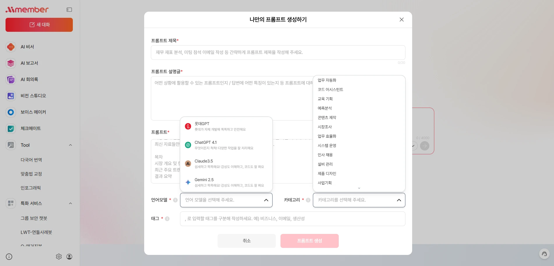 카테고리 : 프롬프트 내용에 해당되는 영역이나 활용 가능한 업무 영역을 선택할 수 있습니다.