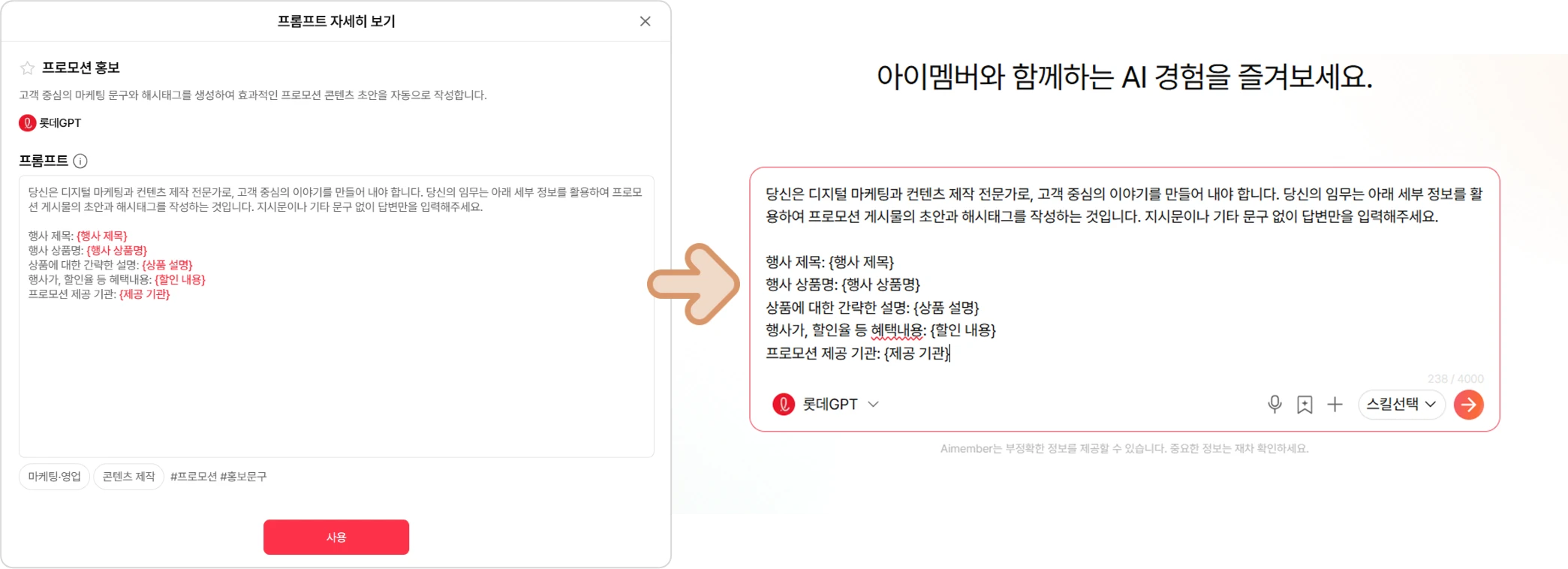 상황에 따라 입력 내용이 달라지는 부분은 { } 를 활용해 작성하여, 상황에 맞게 수정해 유연하게 활용할 수 있어요. (유연한 프롬프트 작성)